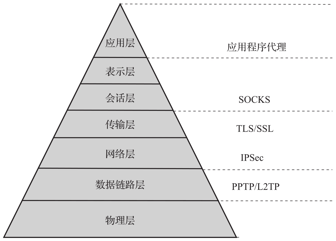 OSI安全体系结构如图1-4所示,其数据链路层包括点到点通道协议(PPTP)以及第二层通道协议(L2TP),网络层包括IP安全协议(IPSec),传输层包括安全套接字层(SSL)和传输层安全协议(TLS),会话层包括SOCKS代理技术,应用层包括应用程序代理。