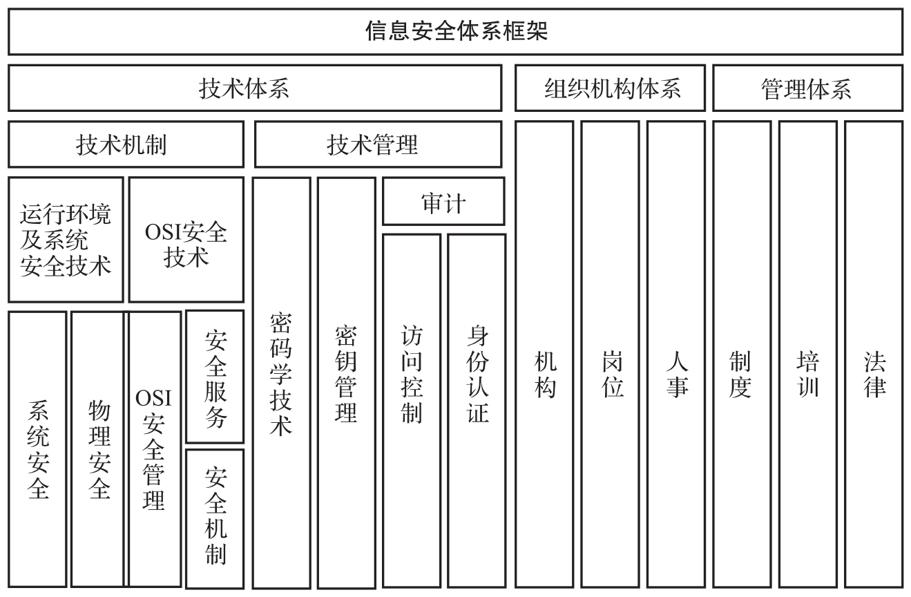 管理体系是组织机构单位按照信息安全管理体系相关标准[如国际信息安全管理标准体系BS 7799(ISO/IEC17799)和中华人民共和国国家标准GB/T 22080—2016/ISO/IEC 27001:2013]的要求,制定信息安全管理方针和策略。“三分技术,七分管理”,管理是信息系统安全的灵魂,信息系统安全的管理体系由相关安全法律、管理制度体系和人员培训管理三个部分组成。法律管理是根据相关的国家法律、法规对信息系统主体及其与外界关联行为的规范和约束,制度管理是信息系统内部依据必要的国家、团体的安全需求制定的一系列内部规章制度,培训管理是确保信息系统安全的前提。
