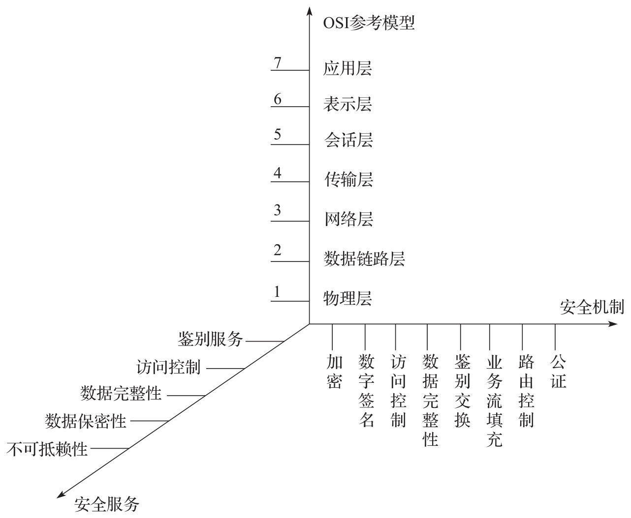图1-2 OSI安全体系结构及安全服务和安全机制