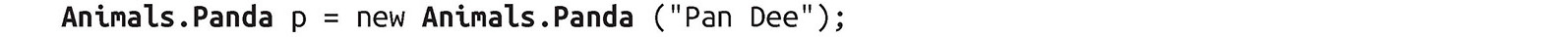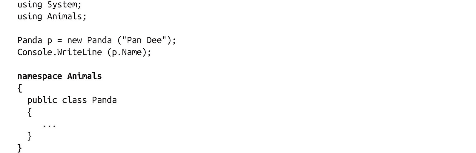 命名空间是组织类型的有效手段,对于大型程序尤为如此。以下代码将 Panda 类定义在 Animals 命名空间中: