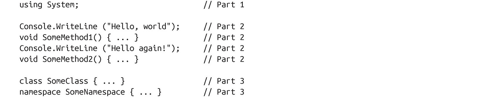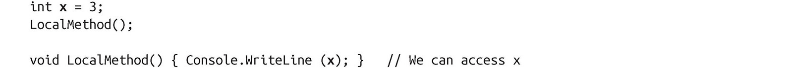 请注意,第2部分(Part 2)是包裹在主方法中的。这意味着 SomeMethod1 和 SomeMethod2 都是局部方法。我们将会在3.1.3.2节中进行完整介绍。而目前最重要的是局部方法(非static的声明)可以访问声明在父级方法中的变量: