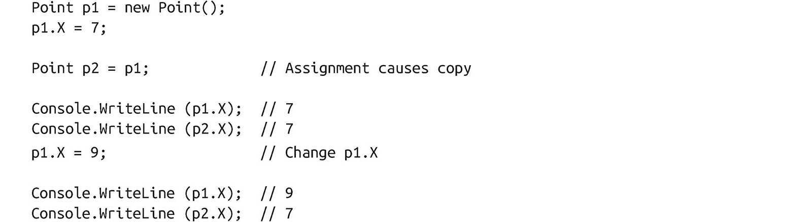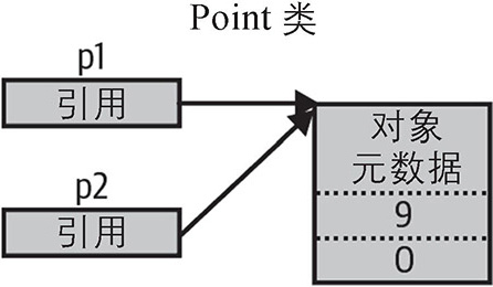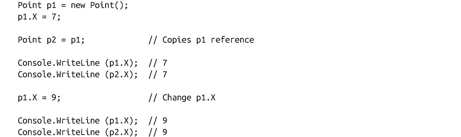 给引用类型变量赋值只会复制引用,而不是对象实例。这允许不同变量指向同一个对象,而值类型通常不会出现这种情况。如果 Point 是一个类,那么若重复之前的示例,则对 p1 的操作就会影响到 p2 了: