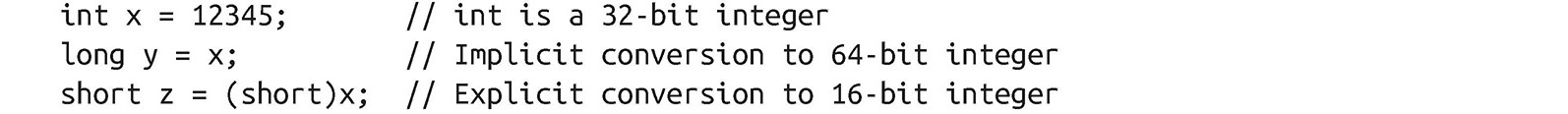 以上的数值转换是C#中内置的。C#还支持引用转换、装箱转换(参见第3章)与自定义转换(参见4.17节)。对于自定义转换,编译器并没有强制满足上述规则,因此没有良好设计的类型有可能在转换时产生意想不到的效果。