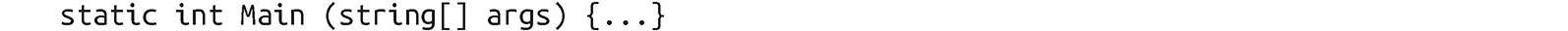 Main 方法可以返回一个整数(而非 void )。该整数将返回到执行环境中(一般非零值代表失败)。 Main 方法也可以接受一个字符串数组作为参数(该数组将包含所有传递给可执行程序的参数),例如: