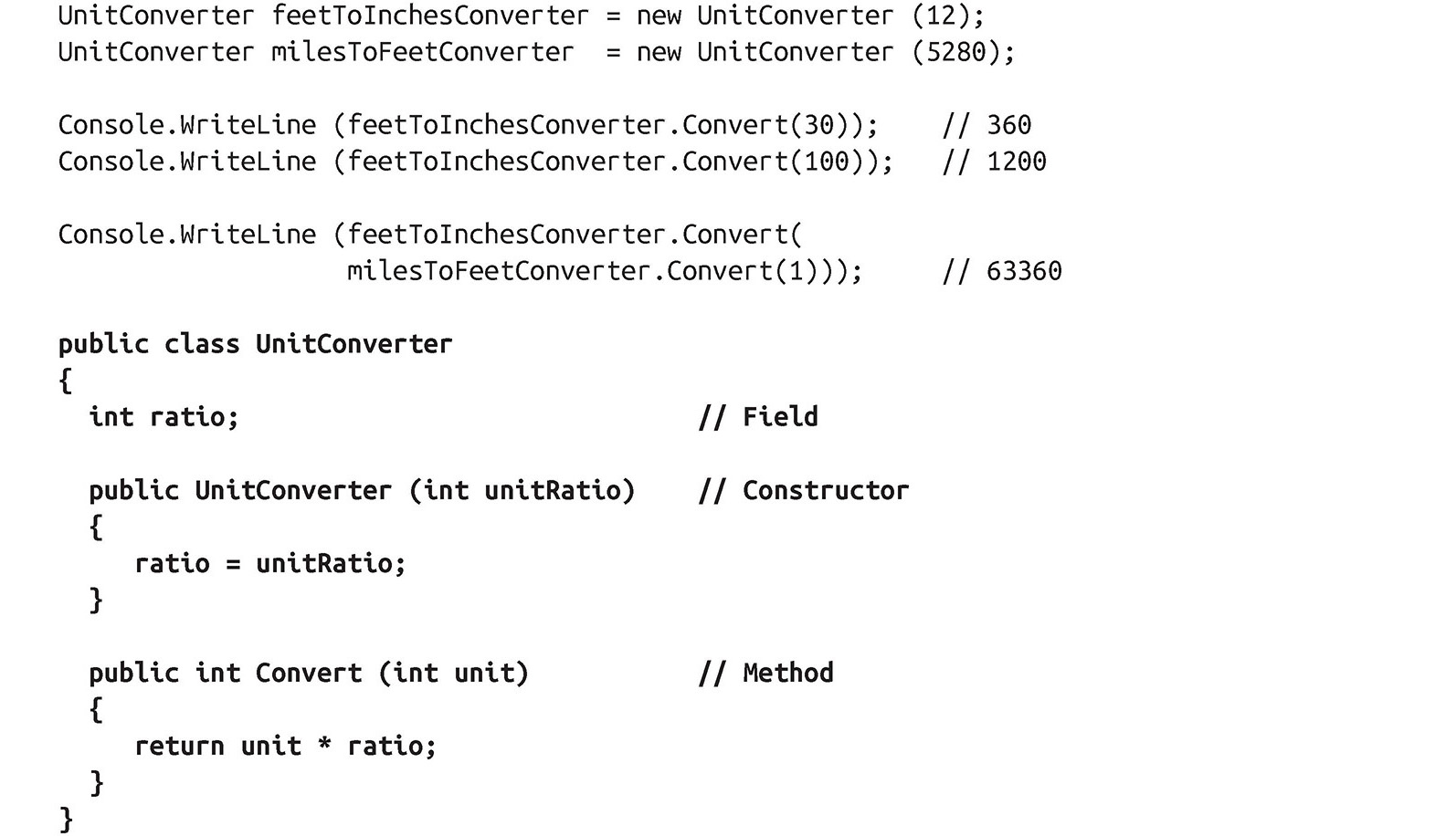类型包含数据成员和函数成员。 UnitConverter 的数据成员是 ratio 字段,函数成员是 Convert 方法和 UnitConverter 的构造器。