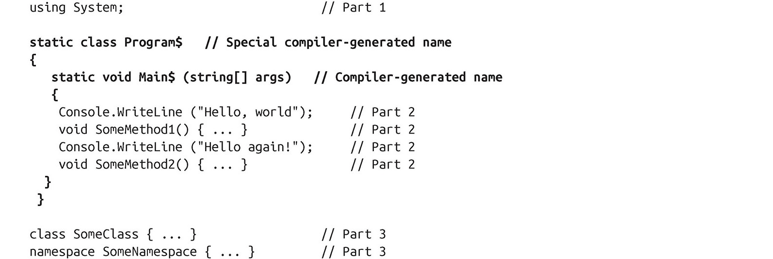 由于CLR并不显式支持顶级语句,因此编译器会将上述代码转换为类似以下形式: