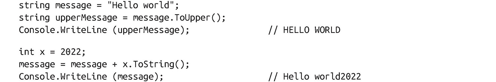 上述示例调用了 x.ToString() 来获得表示整数 x 的字符串。我们几乎可以在任何类型的变量上调用 ToString() 方法。