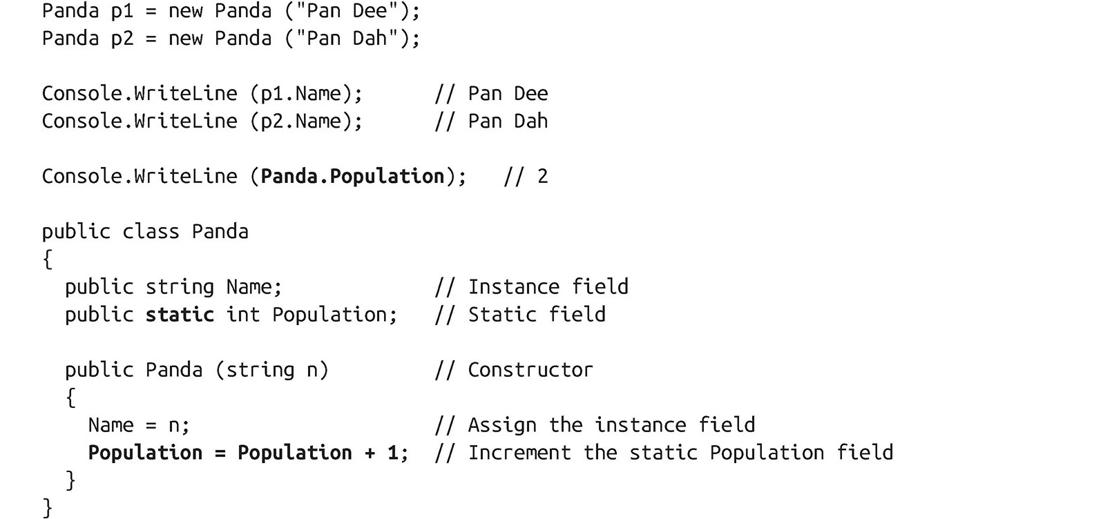 在下面的代码中,实例字段 Name 属于特定的 Panda 实例,而 Population 则属于所有 Panda 实例。我们将创建两个 Panda 实例,先输出它们的名字,再输出总数: