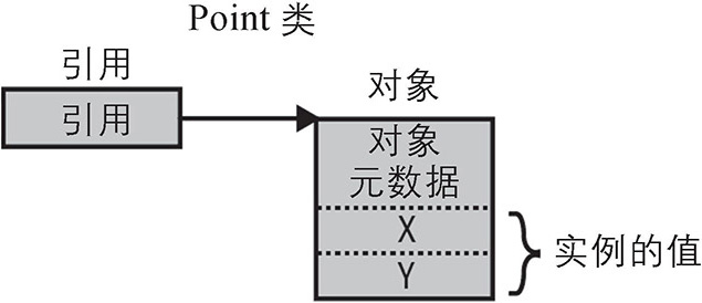 引用类型比值类型复杂,它由对象和对象引用两部分组成。引用类型变量或常量中的内容是一个含值对象的引用。以下示例将重新书写前面例子中的 Point 类型,令其成为一个类而非 struct (参见图2-3):