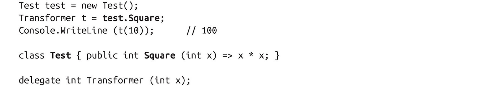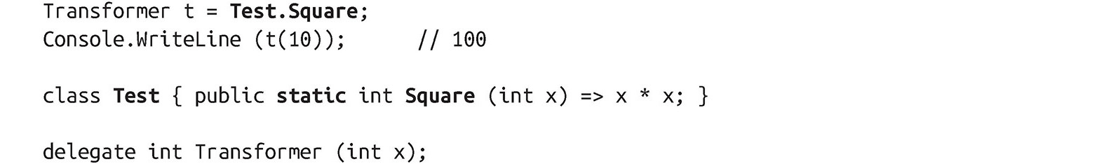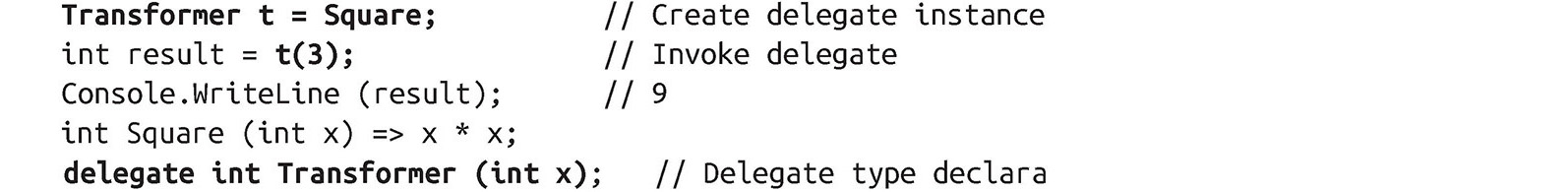 委托类型(delegate type)定义了一类可以被委托实例(delegate instance)调用的方法。具体来说,它定义了方法的返回类型(return type)和参数类型(parameter type)。以下语句定义了一个委托类型 Transformer :
