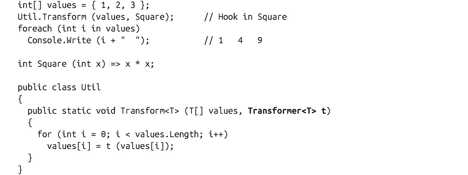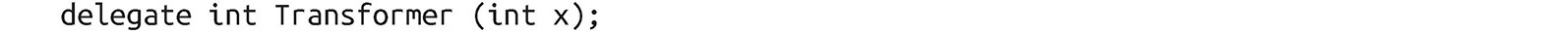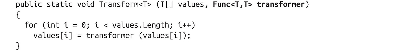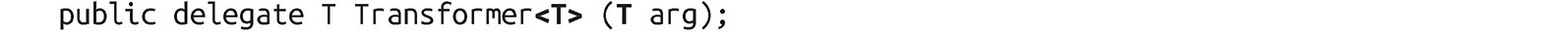这些委托都是非常通用的委托。前面例子中的 Transform 委托就可以用一个带有 T 类型参数并返回 T 类型值的 Func 委托代替: