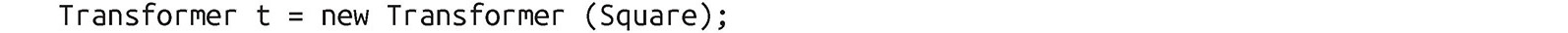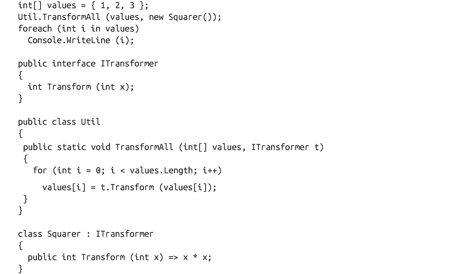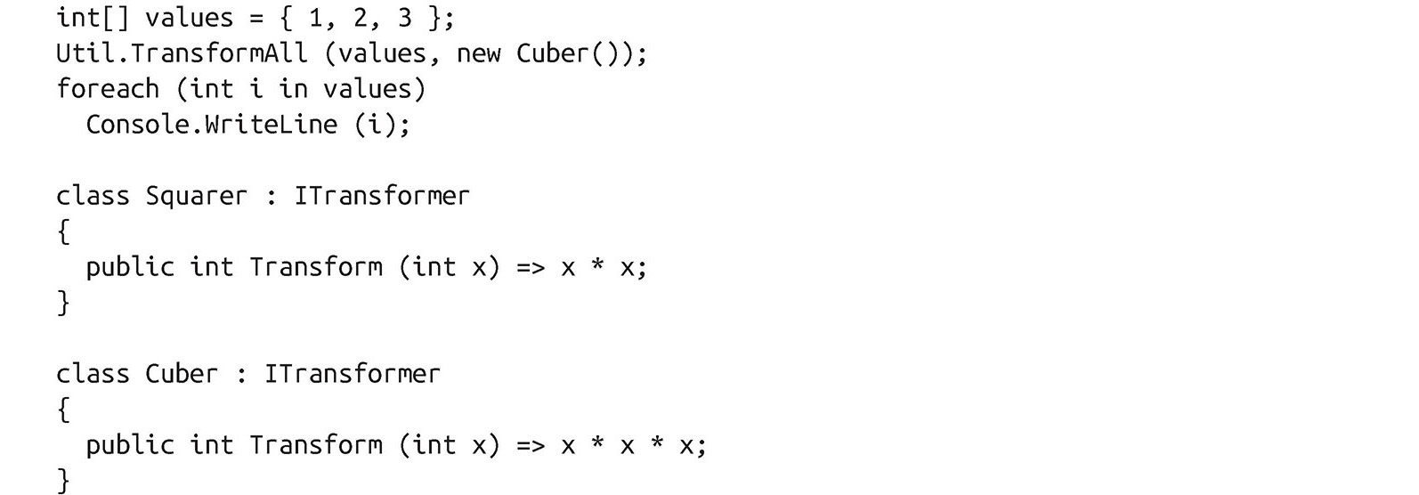 虽然在 ITransformer 的例子中不需要多播,但接口仅仅定义了一个方法,而且订阅者有可能为了支持不同的变换(例如平方或立方变换)需要多次实现 ITransformer 接口。如果使用接口,由于一个类只能实现一次 ITransformer ,因此我们必须对每一种变换编写一个新的类型。这样做很麻烦: