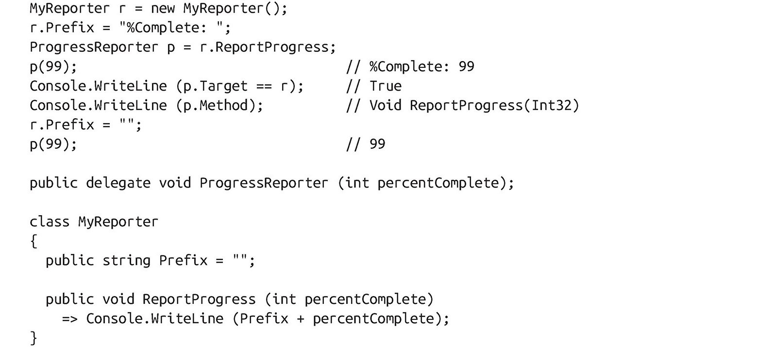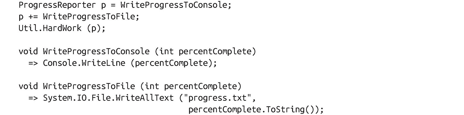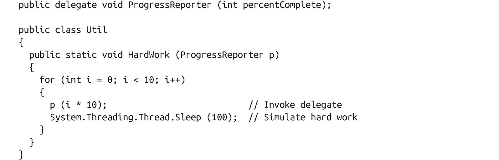 若方法的执行时间很长,那么可以令该方法定期调用一个委托向调用者报告进程的执行情况。例如,在以下代码中, HardWork 方法通过调用 ProgressReporter 委托参数报告执行进度: