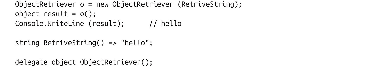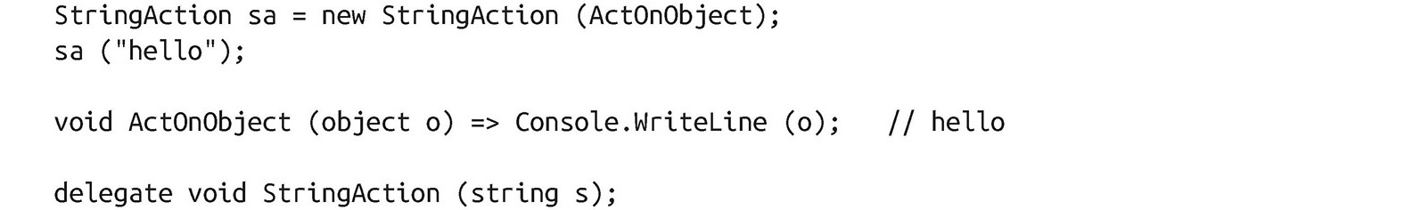 委托仅仅替其他人调用方法。在本例中,在调用 StringAction 时,参数类型是 string 。当这个参数传递给目标方法时,参数隐式向上转换为 object 。
