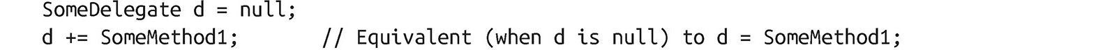 对值为 null 的委托变量进行 + 或者 += 操作等价于为变量指定一个新的值: