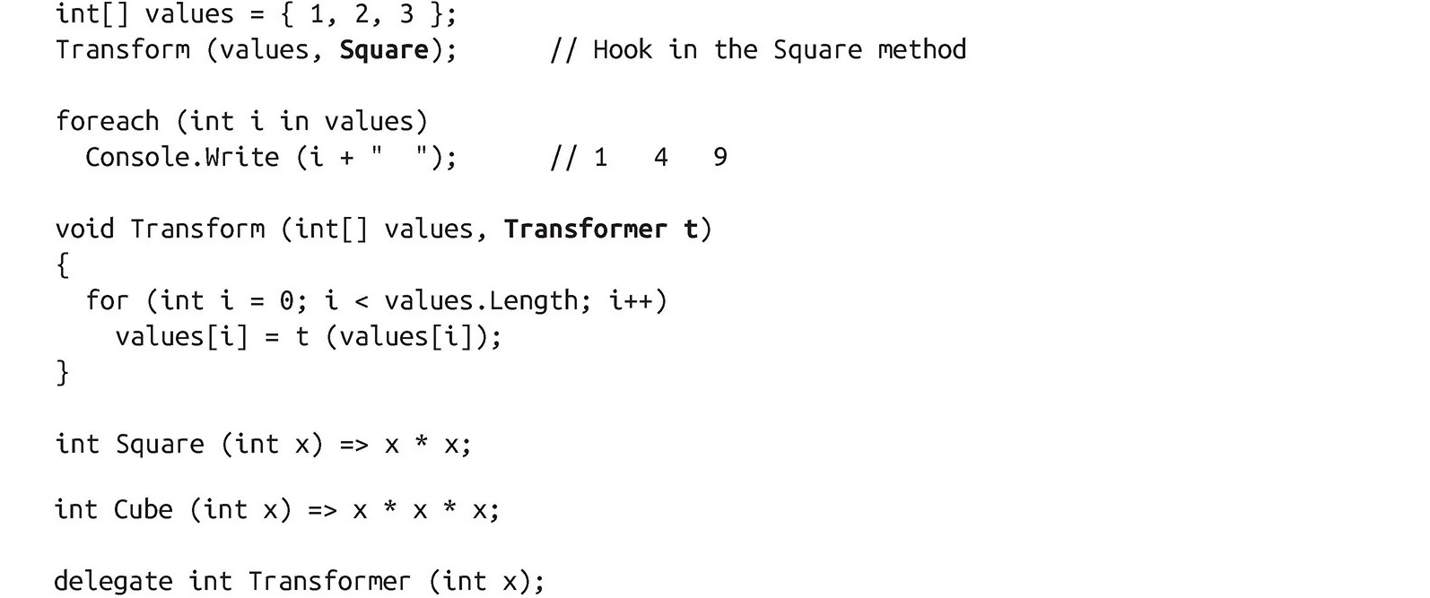 委托变量可以在运行时指定一个目标方法,这个特性可用于编写插件方法。在本例中有一个名为 Transform 的公共方法,它对整数数组的每一个元素进行变换。 Transform 方法接受一个委托参数并以此为插件方法执行变换操作: