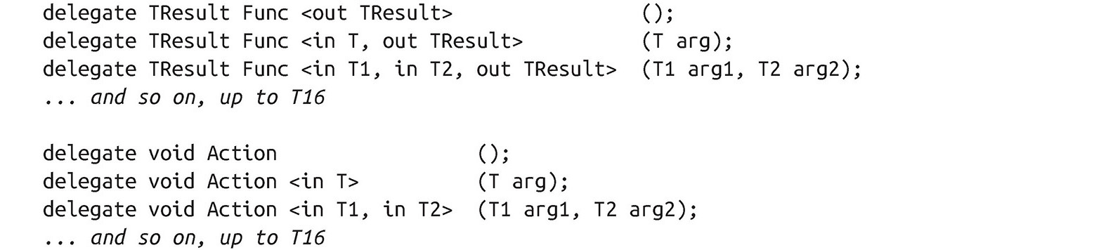 有了泛型委托,我们就可以定义出一些非常通用的小型委托类型,它们可以具有任意的返回类型和(合理的)任意数目的参数。这些小型委托类型就是定义在 System 命名空间下的 Func 和 Action 委托( in 和 out 是标记可变性的修饰符,我们将在后面说明)。
