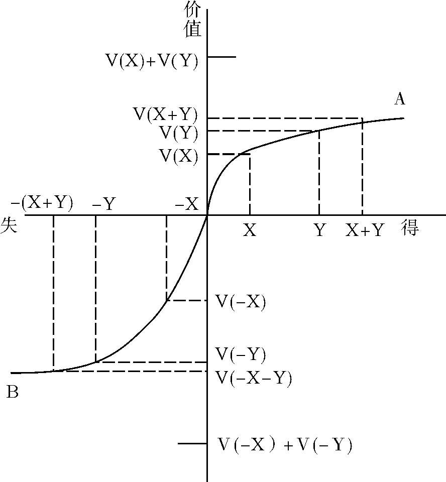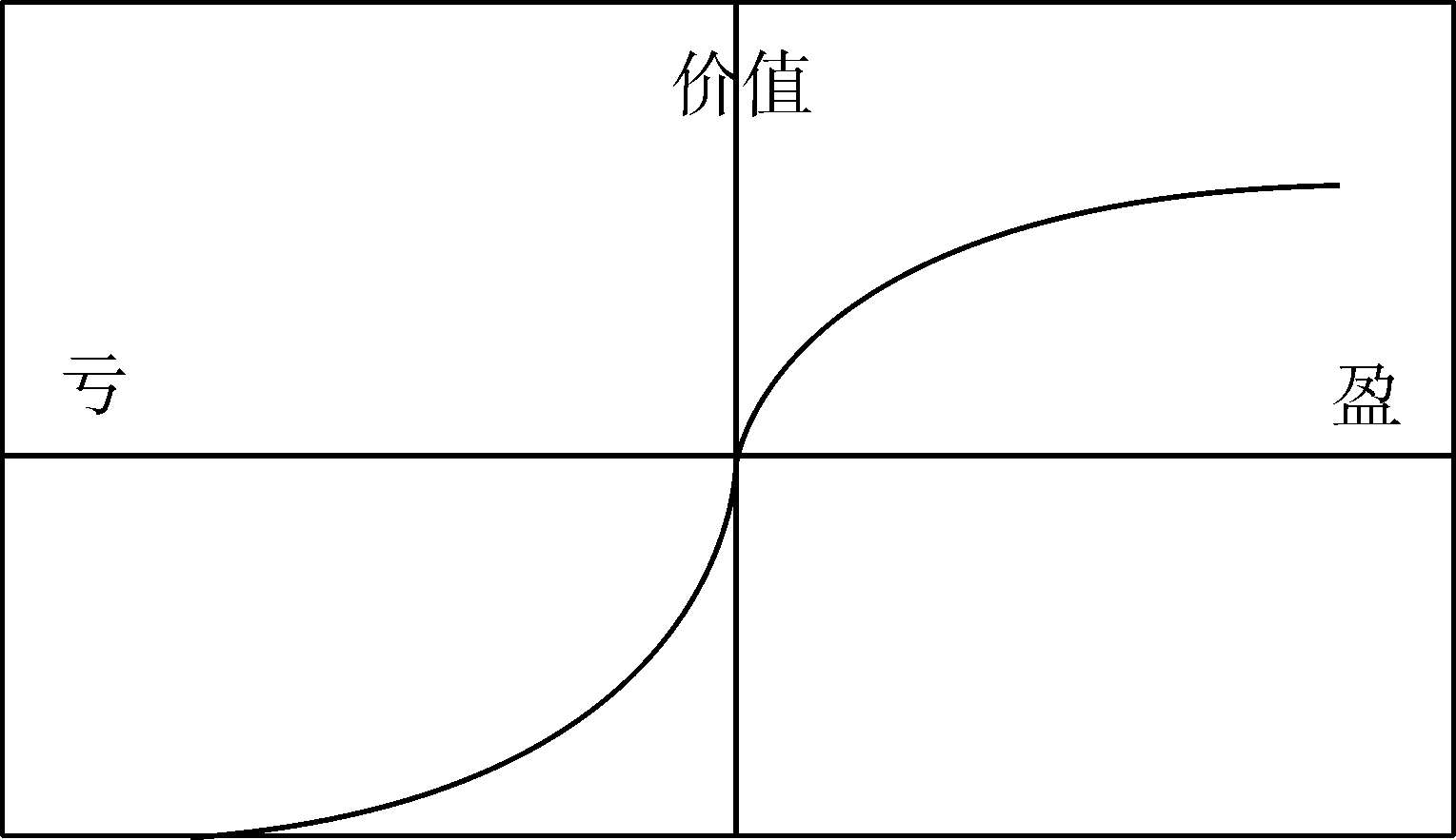 第二,敏感性递减。在得失(盈亏)面前,人们心理体验和感受是有差异的,从得失敏感度曲线可看到(见图 2.1),在图中右侧部分为盈利(获得)曲线,左侧部分为损失曲线。数学信号特征明显的曲线反映出人们的偏好,获得时风险厌恶,而损失时风险偏好。人们的敏感度与离参照点距离有关联,离参照点越近越敏感。