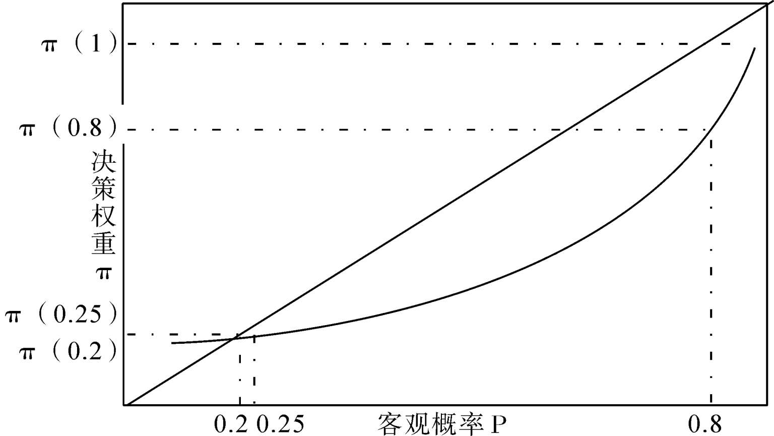 需要注意的是,决策权重并不等同于客观概率。从客观概率与决策权重图(见图 2.2)可看出,横轴为客观概率 P ,纵轴为权重π,概率函数为线性的(对角直线),决策权重函数是非线性的(圆弧状曲线)。