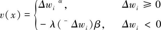 前景理论认为,当 Δw i >0 时, v ″( Δw i )<0;当 Δw i <0 时, v ″( Δw i )>0,并且 v ( Δw i )更为陡峭。这表明,决策者在得到收益时往往表现出风险规避,而在发生损失时,则表现出风险偏好,并且决策者对损失比收益更加敏感。因此,考虑到对于不同价值的主观风险态度,价值函数可进一步表示为