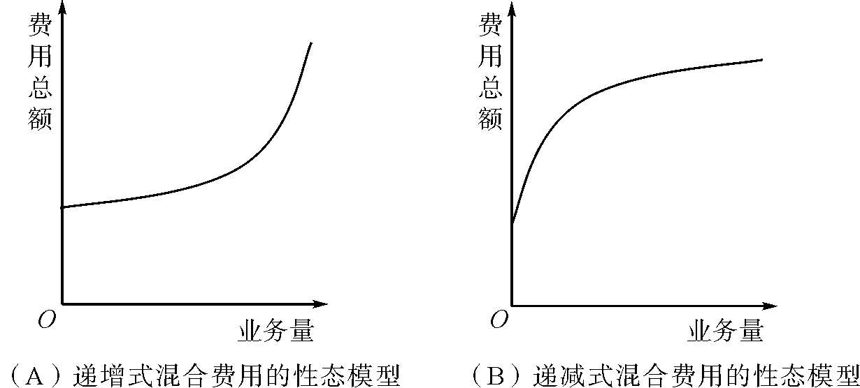 递增型混合费用,其费用的增长幅度随业务量的增长而呈更大幅度变化,成本的斜率呈递增趋势,在平面直角坐标图上表现为一条凹形曲线,如图 2-8 (A)所示。