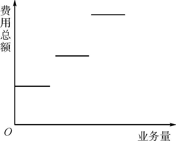 阶梯式混合费用,又称半固定费用。在一定业务量范围内其总额不随业务量的变动而变动,类似于固定费用,当业务量突破这一范围,成本就会跳跃上升,并在新的业务量变动范围内固定不变,直到出现另一个新的跳跃为止。其性态模型如图 2-6 所示。