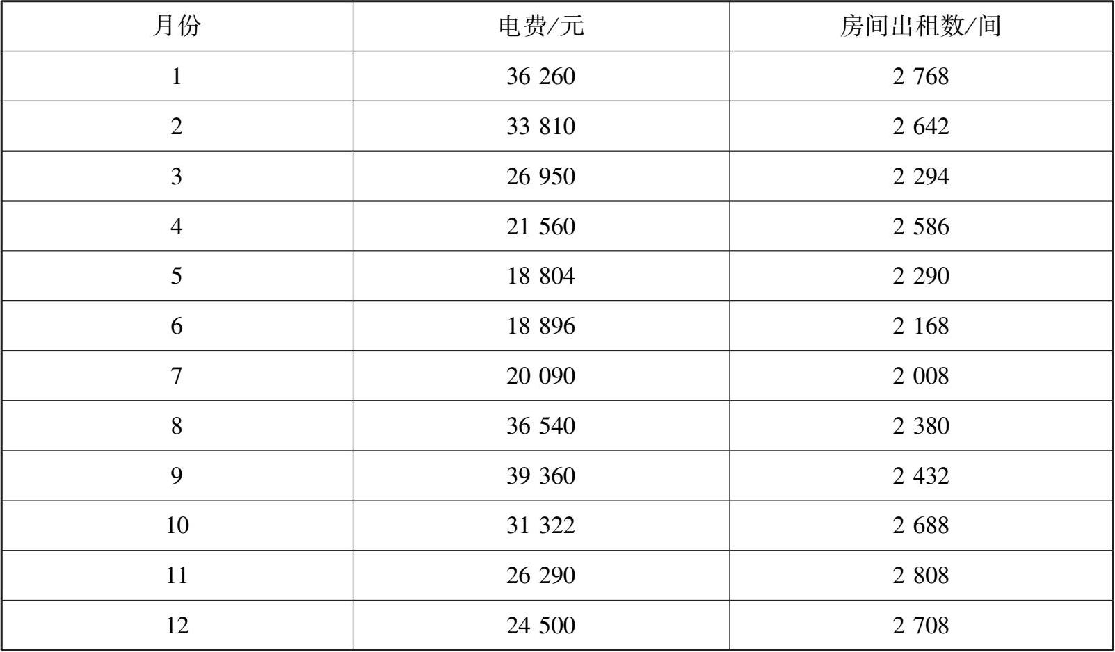 【例 2.12】银杏标准酒店客房 2023 年度电费和房间出租量资料如表 2-13 所示。