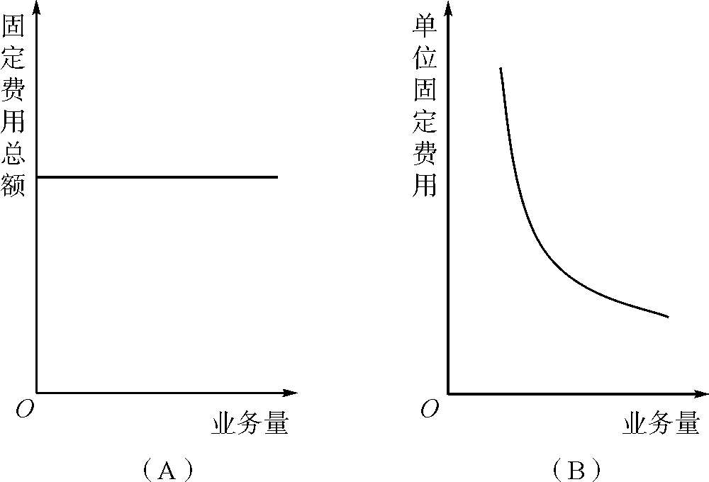 (2)单位固定费用的反比例变动性。由于上一个特点,单位产品负担的固定成本必然随着业务量的变动呈反比例变动,如图 2-3 (B)所示。