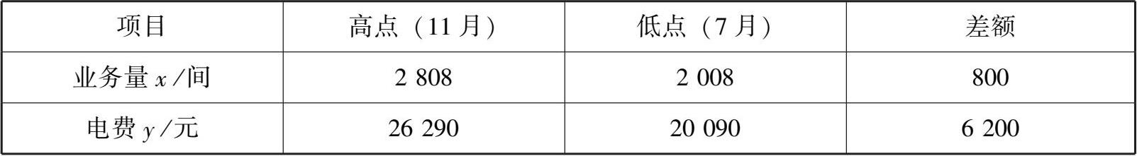 解:根据表 2-13 的有关数据,可知银杏标准酒店的客房电费在相关范围内的变动情况,其最高业务量和最低业务量实际发生的电费如表 2-14 所示。