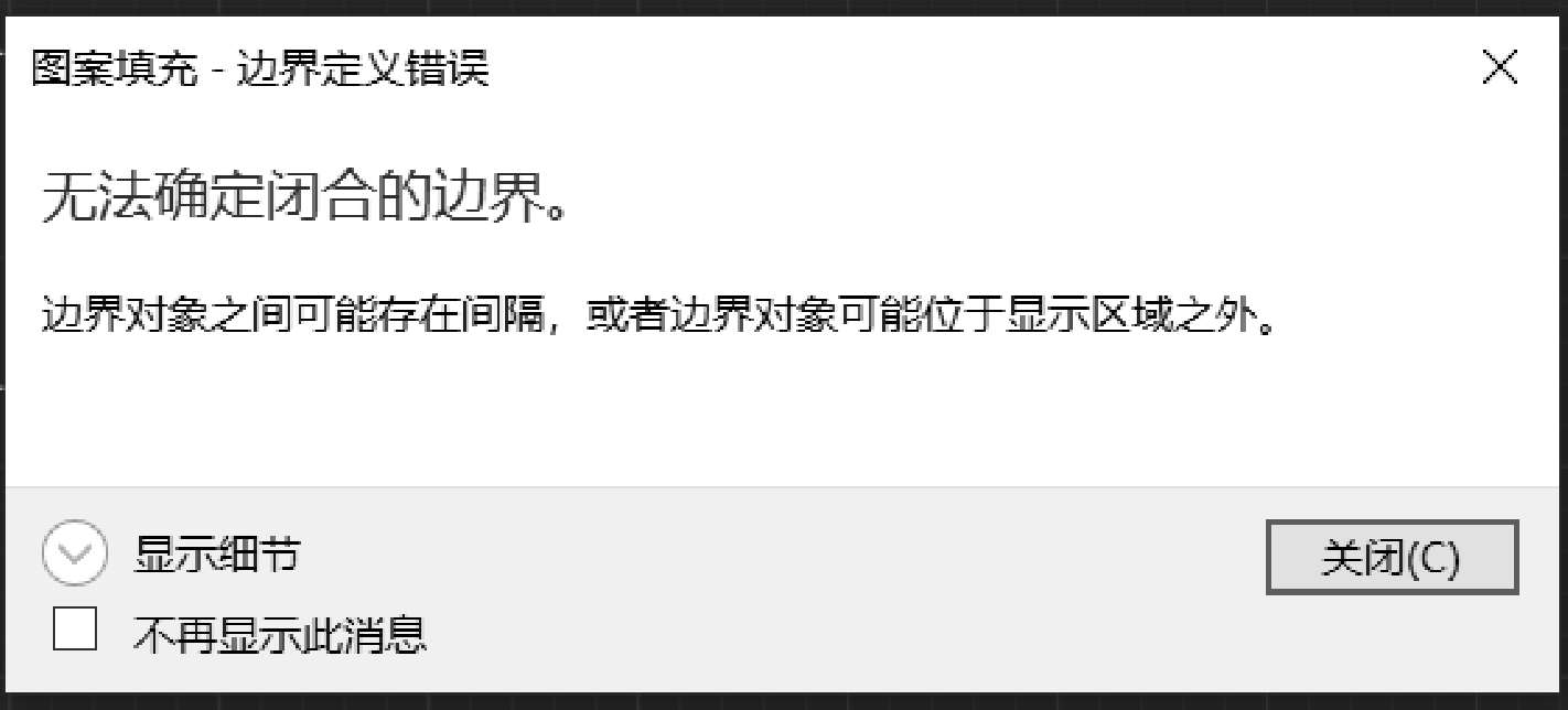 构成的图形区域边界的实体必须在它们线端点处相交,否则可能会产生错误的填充。在右上角不封闭的情况下,用户在填充时会出现如图2.2所示的警告框。而如图2.3所示的是封闭图案,就可以填充。