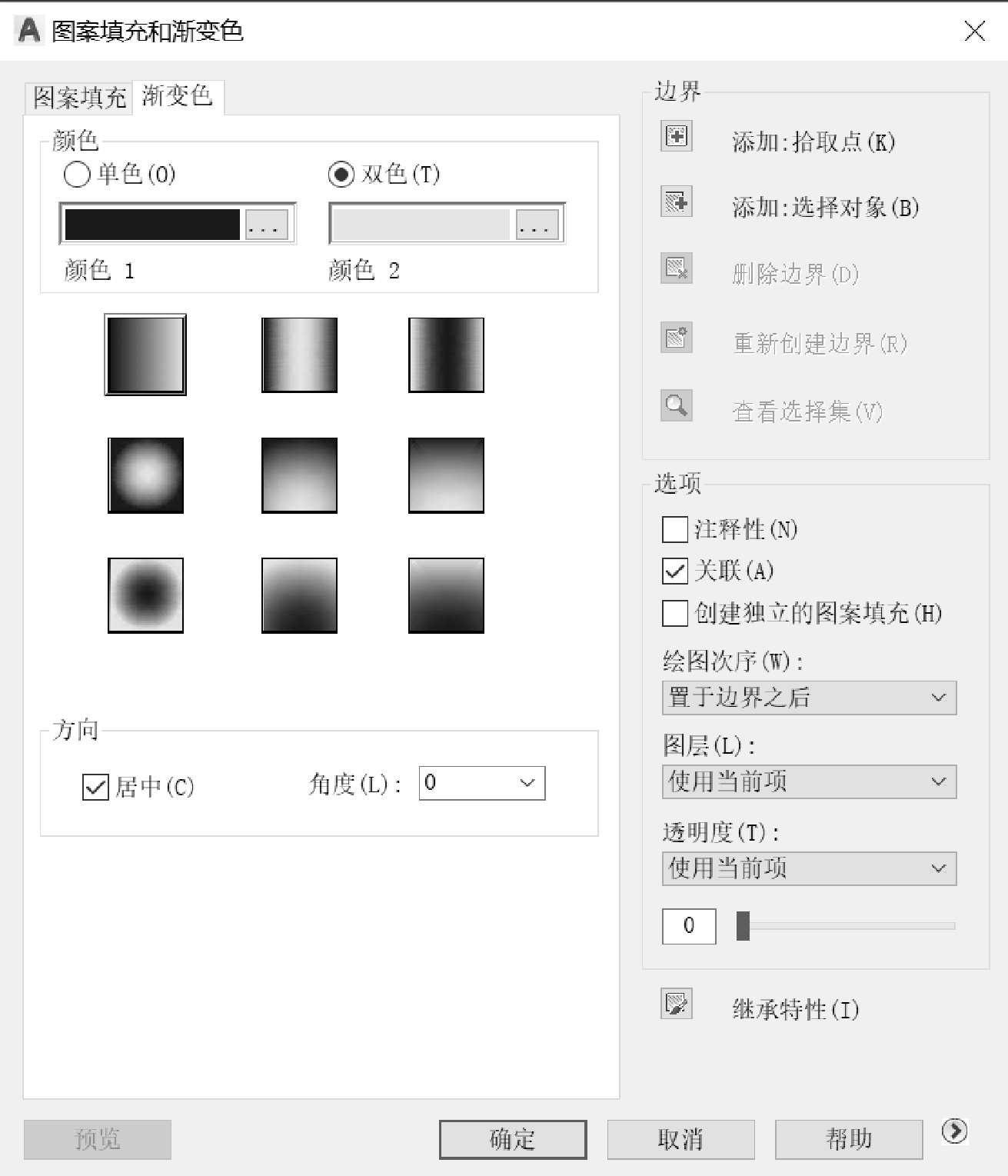 打开“图案填充和渐变色”对话框,主要有以下3种方法:
