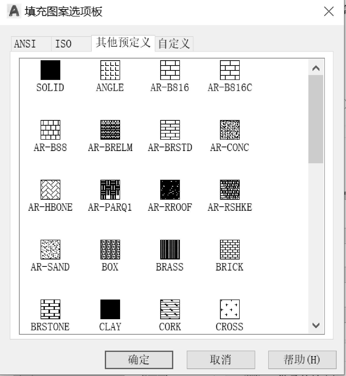 图案选项,用于确定标准图案文件中的填充图案。用户可从中选取填充图案。选择所需要的填充图案后,在“样例”选项的图像框内会显示该图案。用户只有在“类型”下拉列表框中选择“预定义”选项,此项才以正常亮度显示,即允许用户从自己定义的图案文件中选取填充图案。如果选择的图案类型是“其他预定义”,单击“图案”下拉列表框右边的按钮,系统会弹出“填充图案选项板”对话框,该对话框中显示所选类型所具有的图案,用户可从中确定所需要的图案,如图2.8所示。