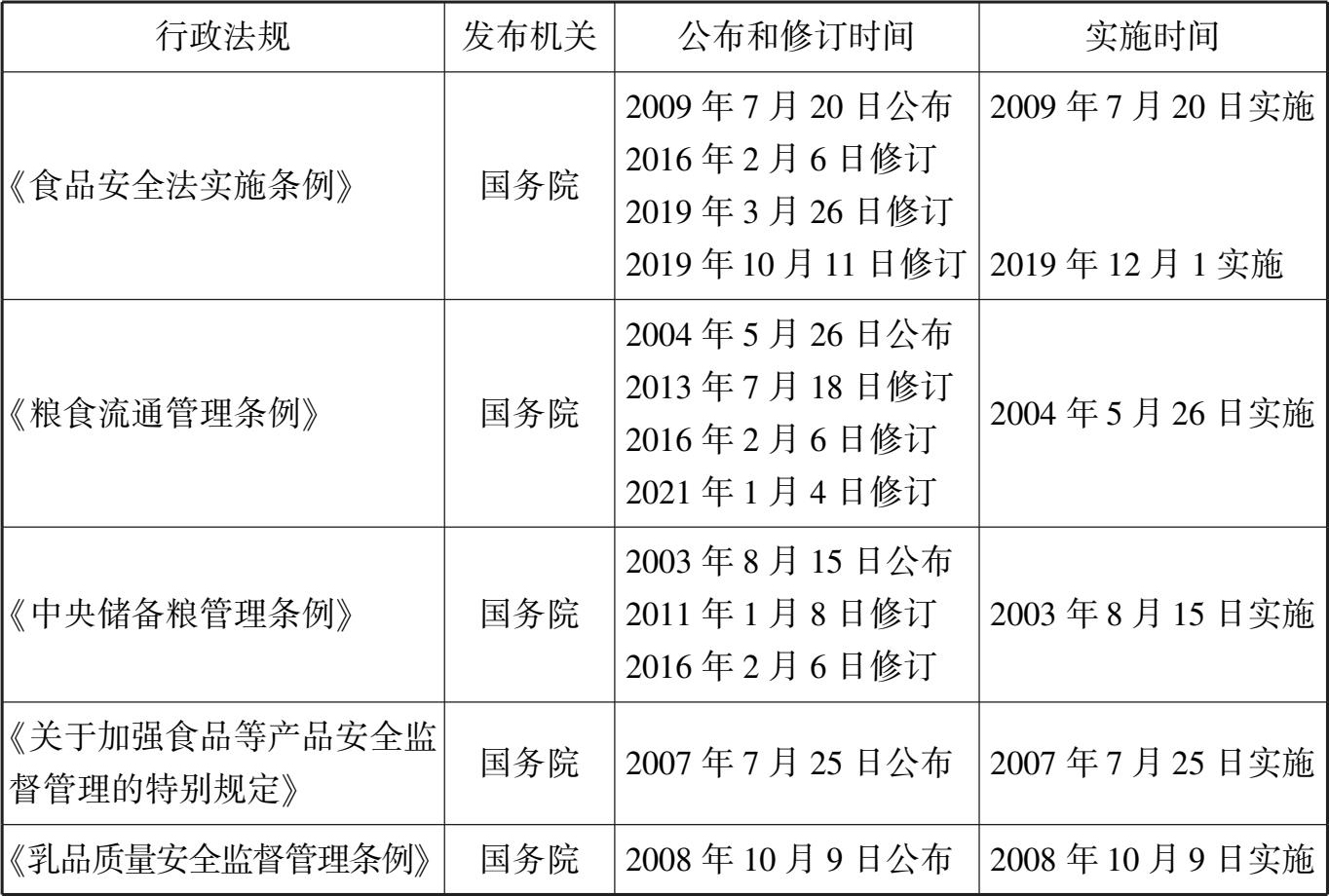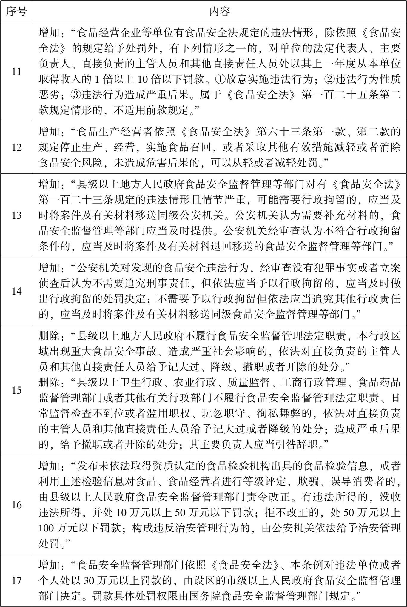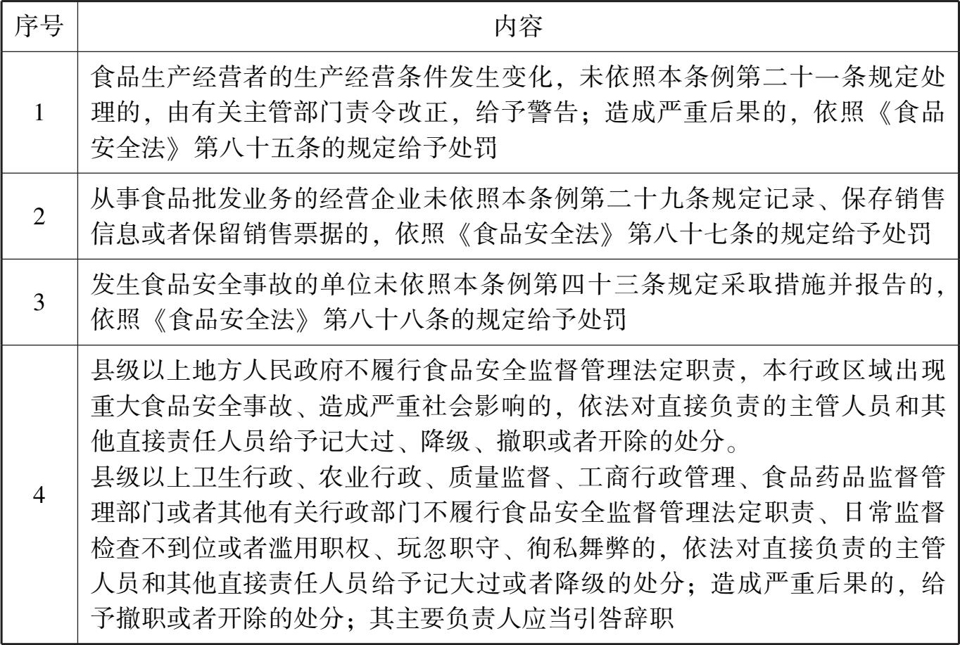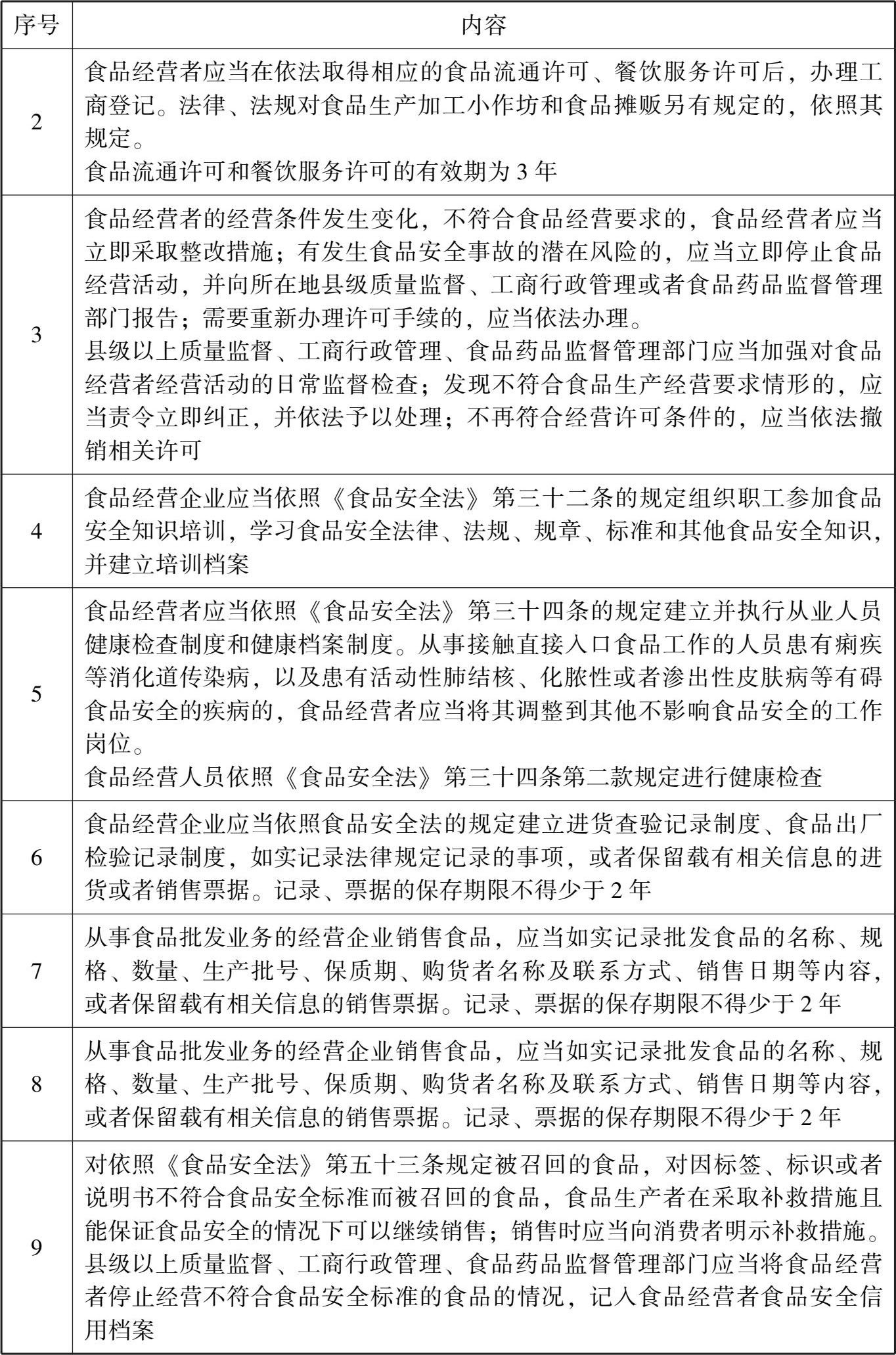 《食品安全法》颁布后,2009年7月20日国务院第557号院令根据《食品安全法》制定并发布了《中华人民共和国食品安全法实施条例》(简称《食品安全法实施条例》),自公布之日起实施。《食品安全法实施条例》是重要的食品安全行政法规,在《食品安全法》的基础上增加了更为详细、可操作性的规定,具有很强的行政执法适用性(表2-17、表2-18、表2-19)。