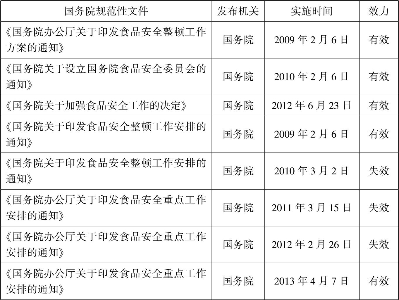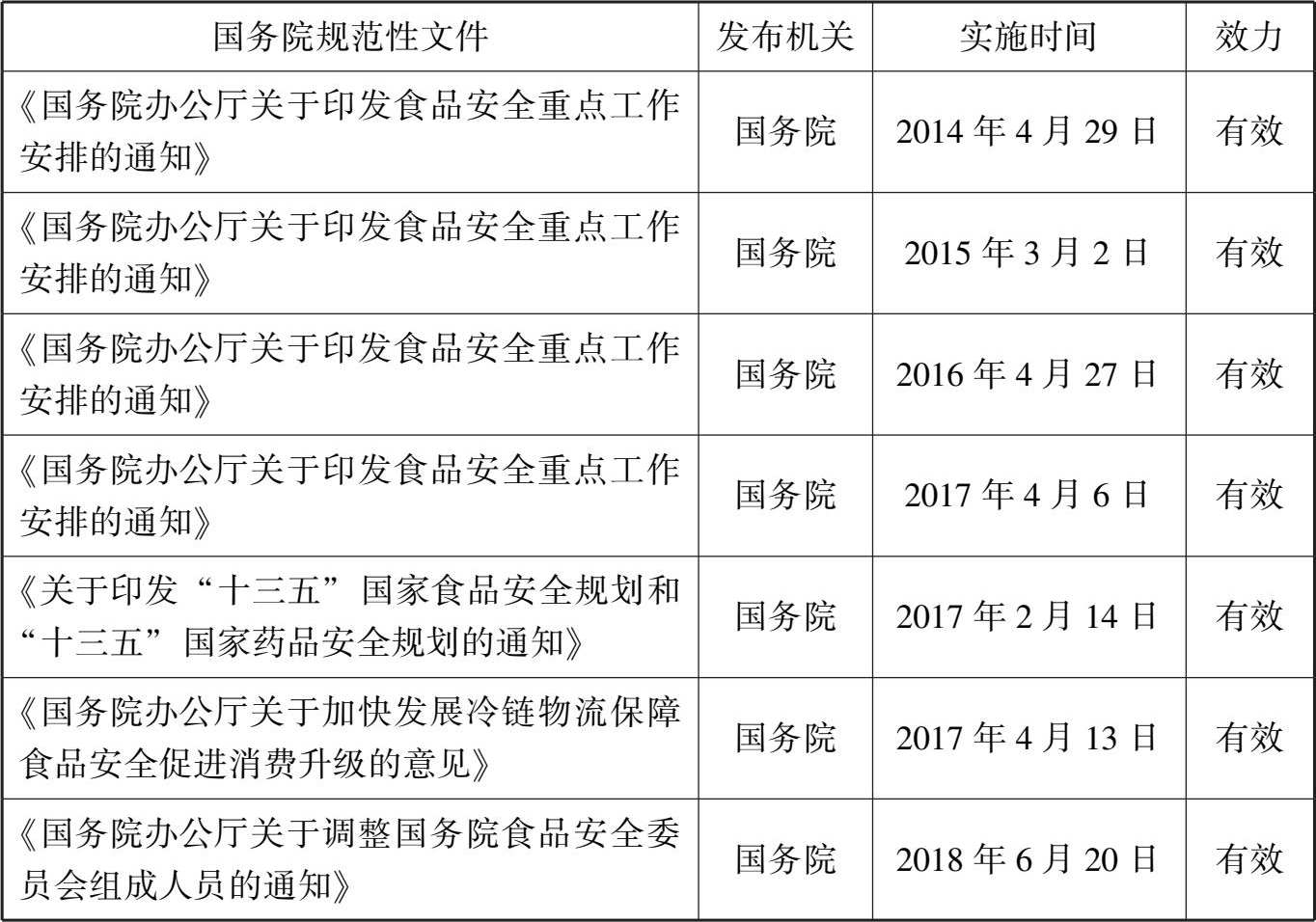 国务院自2009年、2010年连续两年发布《国务院关于印发食品安全整顿工作安排的通知》之后,于2011年始至2017年每年发布《国务院办公厅关于印发食品安全重点工作安排的通知》。除2010年发布的《国务院关于印发食品安全整顿工作安排的通知》和2011年、2012年发布的《国务院办公厅关于印发食品安全重点工作安排的通知》已经失效,2013—2017年每年发布的《国务院办公厅关于印发食品安全重点工作安排的通知》均为现行生效。