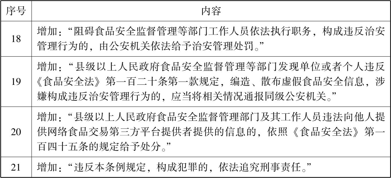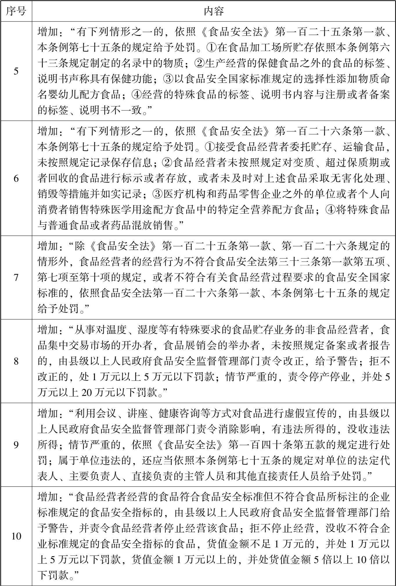 《食品安全法》于2018年12月29日修正。与此相对应,2019年3月26日国务院第42次常务会议通过《食品安全法实施条例》的修订,2019年10月11日国务院令第721号予以公布,自2019年12月1日起施行。在内容上,该条例从之前的10章64条扩充至10章86条,坚持“最严谨的标准、最严格的监督管理、最严厉的处罚、最严肃的问责”的“四个最严”要求,对《食品安全法》进行了细化和补充规定,被称为“史上最严”《食品安全法实施条例》(表2-21、表2-22、表2-23)。