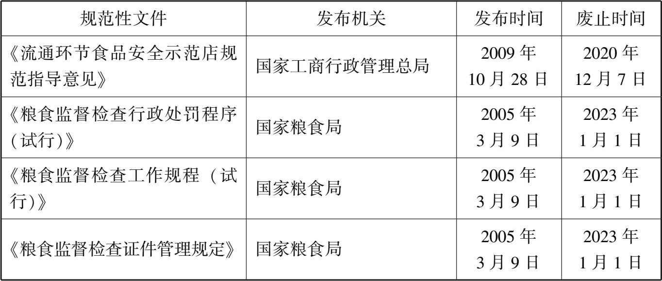 (3)2005年3月9日国家粮食局印发且施行的《粮食监督检查行政处罚程序(试行)》《粮食监督检查工作规程(试行)》《粮食监督检查证件管理规定》,2023年1月1日废止。