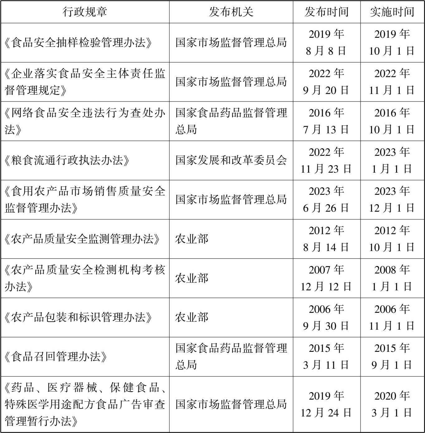 (9)2016年1月5日国家食品药品监督管理总局发布的《食用农产品市场销售质量安全监督管理办法》,2016年3月1日起施行,2023年12月1日废止。