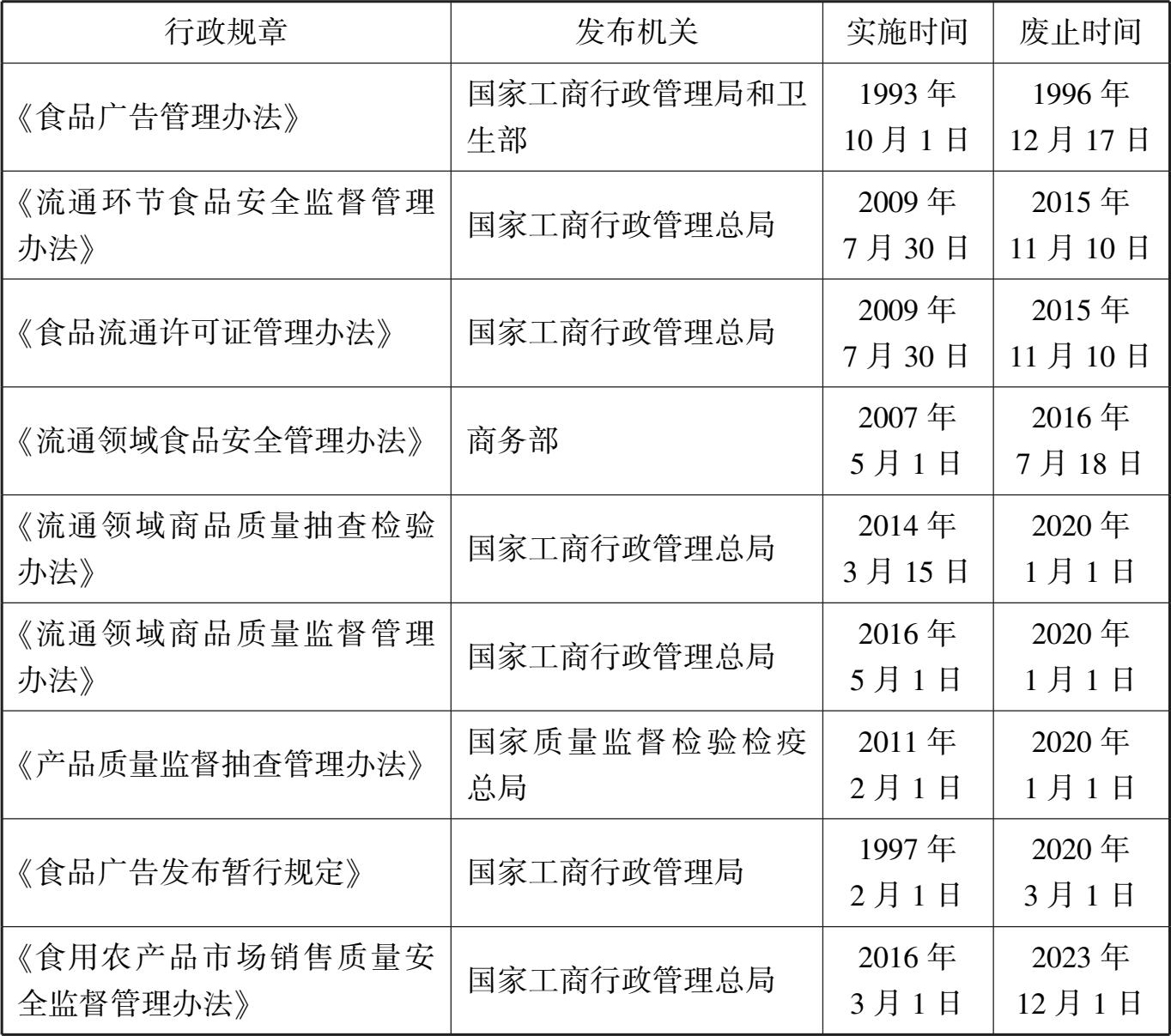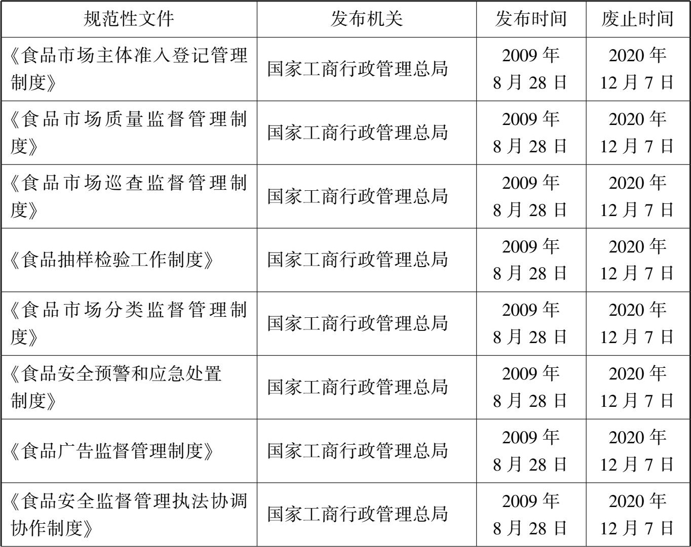 (1)2009年8月28日国家工商行政管理总局发布的《食品市场主体准入登记管理制度》《食品市场质量监督管理制度》《食品市场巡查监督管理制度》《食品抽样检验工作制度》《食品市场分类监督管理制度》《食品安全预警和应急处置制度》《食品广告监督管理制度》《食品安全监督管理执法协调协作制度》共八项制度,2020年12月7日废止。