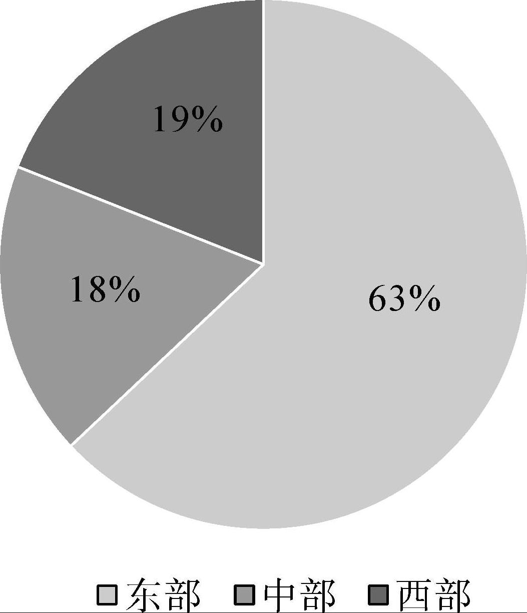 2016 年,我国的专业展览馆在省份间的分布呈现出两极分化的状态。从展览馆的数量上看,山东省的展馆数量最多,达到 44 个,其次是江苏省,数量为 31 个,四川省和广东省分列第三、第四位,数量分别为 25 个和 24 个。为了更加清晰地看出我国专业展览馆在不同地区的分布情况,本书绘制了我国专业展览馆地区分布图(见图 1-10)。可以看出,我国东部沿海经济发达省份展览馆数量较多,占全国展览馆总量的 63%,中西部省份展览馆数量相对较少,分别占全国展览馆总量的 18%和 19%。从整体上看,我国展览馆呈现出明显的区域特征。