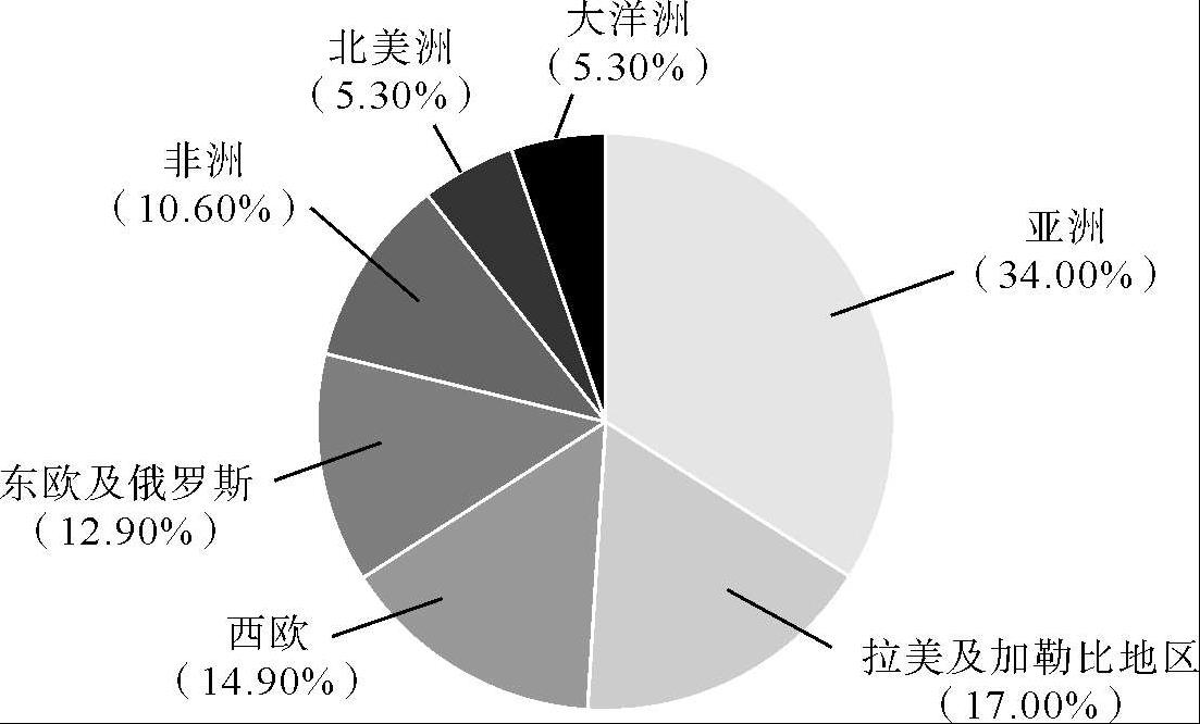 近年来,我国得到国际展览联盟(UFI)认证的展览会项目和UFI认证会员单位数量均持续增加,但各省(自治区、直辖市)分布不均。截至 2015 年年底,我国得到UFI认证的会员单位数量达到 95 个,经UFI认证的展览会项目达到 77 个,认证的会员单位主要分布在我国的北京、广东、上海三地,其中北京的会员单位数量达到 29 个,广东省的会员单位数量达到 24 个,上海市的会员单位数量达到 22 个,三地的会员单位数量约占会员单位总数的79%,认证展览会项目主要分布在上海市、广东省和北京市,其中上海市 21个,广东省 20 个,北京市 18 个,三地的展览会项目数量约占总展览会项目的 77%。另外,2015 年,我国共有 29 家会展单位到境外 35 个国家举办贸易展览会(自办展)94 场,同比增长 19%;展出面积达 13.9 万平方米,同比增长 2.3%;参展企业近 9 000 家,同比增长 5.3%。从全球的地域分布来看,34%的展览集中在亚洲,其次是拉美及加勒比地区、西欧、东欧和俄罗斯、非洲、北美洲和大洋洲,占比分别为 17.0%、14.9%、12.9%、10.6%、5.3%和 5.3%(见图 1-11)。截至 2015 年 10 月 31 日,全国 74 个会展单位一共在 33 个共建“一带一路”国家办展 509 场,占全部展览的 36.8%;展出总面积达 22.9 万平方米,占总量的 35.8%;参展企业 1.6 万家,占总量的 34.3%。
