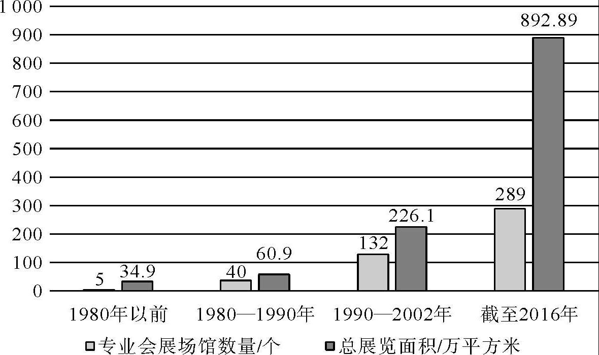 1990 年之前,展览数量少、展览面积小,并且发展速度缓慢。进入 21 世纪后,我国专业展览馆的数量和展览面积呈现出爆发式增长。2016 年,全国场馆数量已经达到 289 个,展馆总面积为 892.89 万平方米,居世界前列(见图 1-9)。