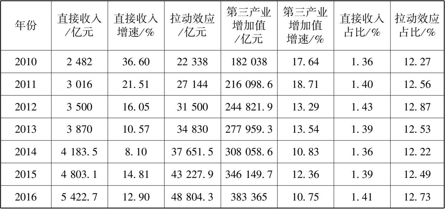 2010 年,我国会展业直接收入为 2 482 亿元,占第三产业增加值的1.36%;拉动效应为 22 338 亿元,占第三产业增加值的 12.27%。2016 年,我国会展业直接收入为 5 422.7 亿元,占第三产业增加值的 1.41%;拉动效应为 48 804.3 元,占第三产业增加值的 12.73%。会展收入增速和第三产业增加值增速接近(见表 1-6)。