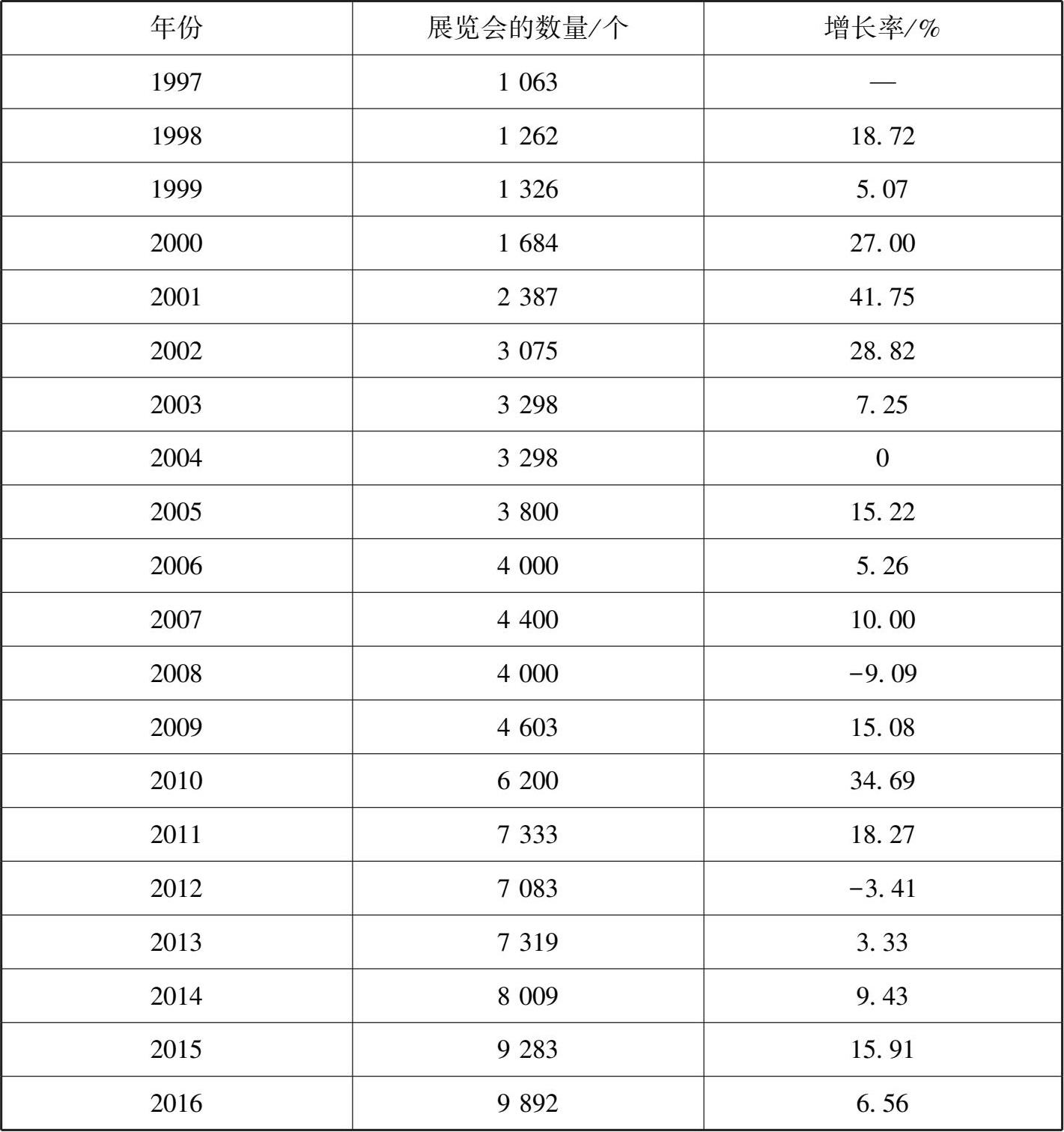 表 1-5 1997—2016 年中国国内展览会数量及增长率