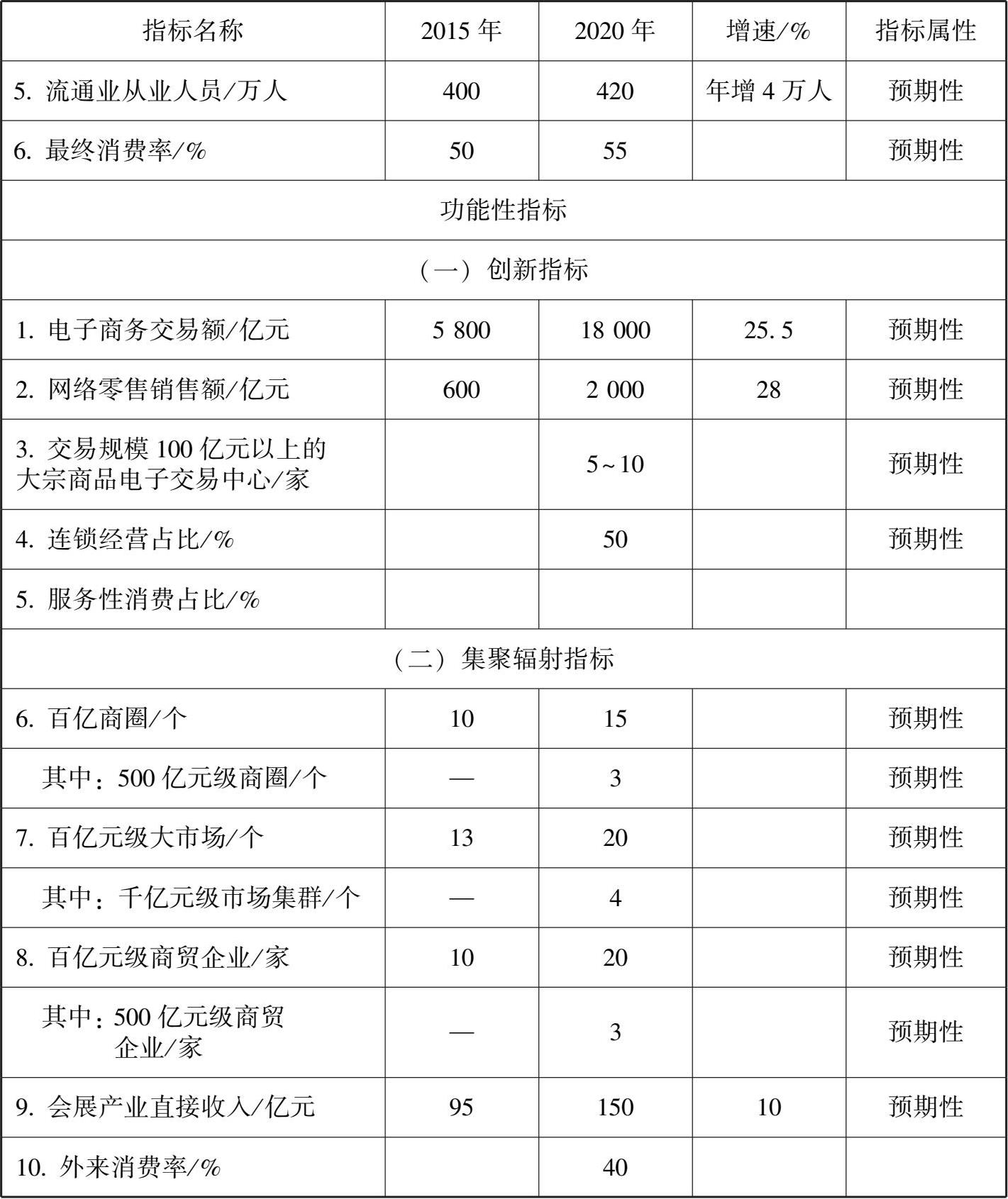 ①商贸服务业现代化水平显著提高。现代商贸服务业体系基本形成,电子商务及网络零售产业加快发展,电子商务交易额突破 18 000 亿元,其中网络零售额突破 2 000 亿元;都市区城市物流配送网络体系基本形成;连锁零售额占社会消费品零售总额的比重突破 50%;新型消费、服务性消费占比显著提高,商贸服务业创新水平显著提升,流通成本大幅度下降,流通效率明显提高。