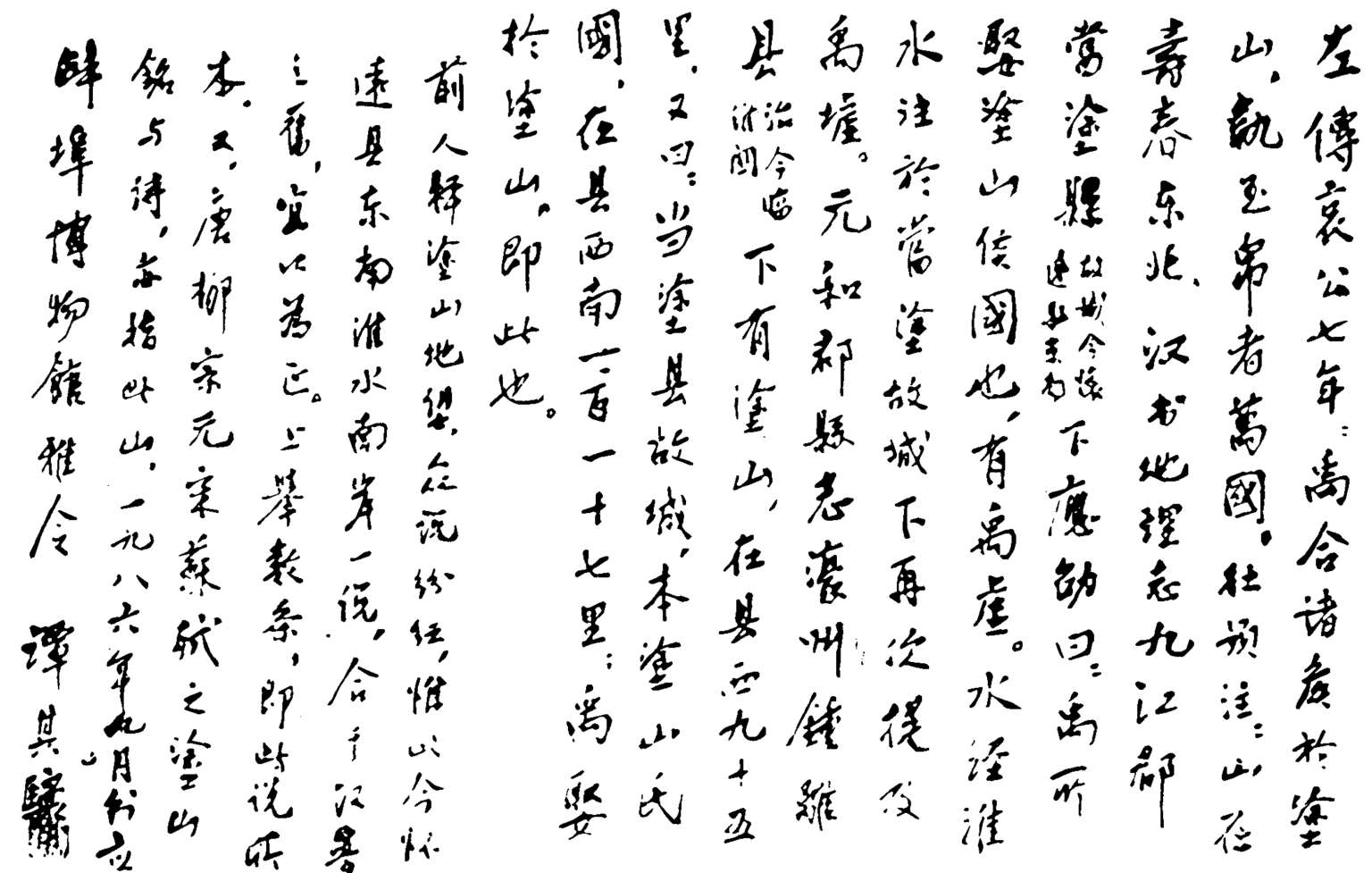 谭其骧是我国当代著名历史地理学家、复旦大学历史系教授。他所主编的《中国历史地图集》,在国内外享有盛誉。他于1986年9月在行将赴日讲学之前,亲笔为蚌埠博物馆题写《涂山考》,再次论断今怀远县东南淮水南岸的涂山就是历史上禹会诸侯的地方。