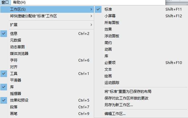 AE CC 2015采用浮动面板模式,每个面板可随意移动,以及调节大小或关闭。面板布局形式可在“窗口/工作区”中选择,也可组合自己的个性化面板,通过“另存为新工作区…”保存,如图1-2-4所示。