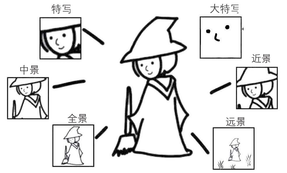 景别是指摄影机在距被摄对象的不同距离或用变焦镜头摄成的不同范围的画面。景别一般可划分为大特写、特写、近景、中景、全景、远景6种,如图1-1-10所示。