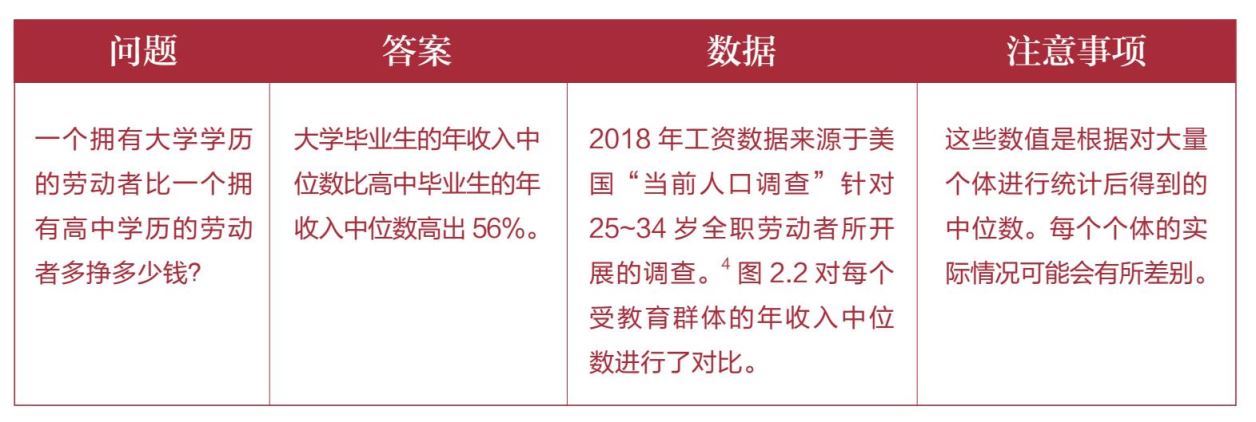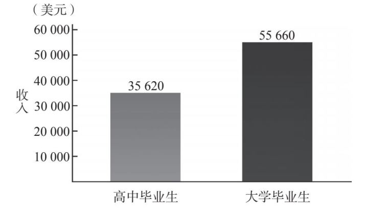 注:那些最高学历为高中的人,年收入中位数是35 620美元,而那些最高学历为大学的人,年收入中位数是55 660美元。