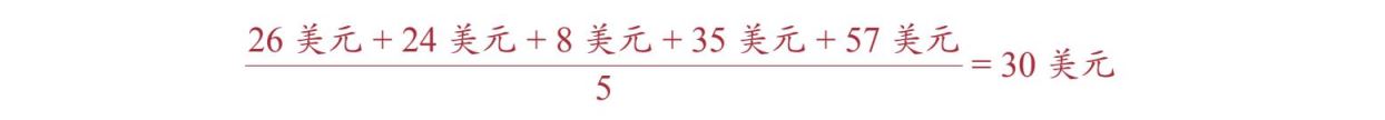 针对上面的例子,如果我们将这5个人的工资加在一起,再除以5,就可以计算出他们的工资均值是每小时30美元。