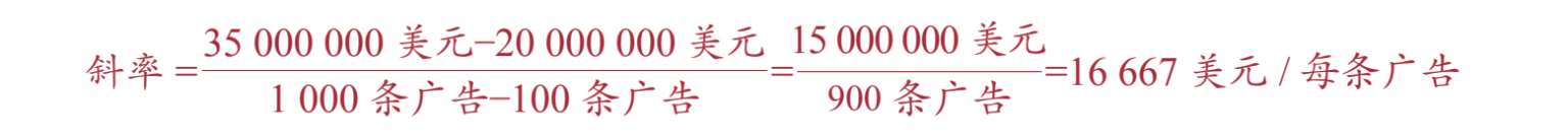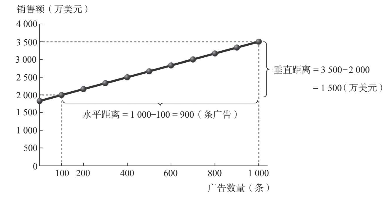 在这个例子中,随着广告数量从100条增加到1 000条,销售额从2 000万美元增加到3 500万美元。因此,垂直距离,即销售额( y 轴)的变化是1 500万美元;水平距离,即广告数量( x 轴)的变化是900条。因为两者都在上升(往相同方向移动),所以斜率为正: